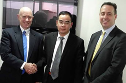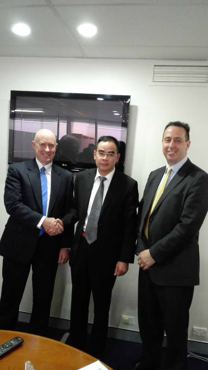 公司董事長(中)與澳大利亞工商保安協(xié)會會長凱文(左)和CEO布朗(右)合影